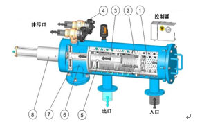 水力驅(qū)動自清洗過濾器由主管組件、端蓋組件、細(xì)濾芯組件、粗濾芯組件、吸污器組件、水力馬達(dá)、水力缸組件、排污閥、管路控制系統(tǒng)等主要零部件組成。水由入水 口進(jìn)入過濾器,首先經(jīng)過粗濾芯組件濾掉圈套顆粒的雜質(zhì),然后到達(dá)細(xì)濾網(wǎng),通過細(xì)濾網(wǎng)濾除細(xì)小顆粒的雜質(zhì)后,清水由出水口排出。