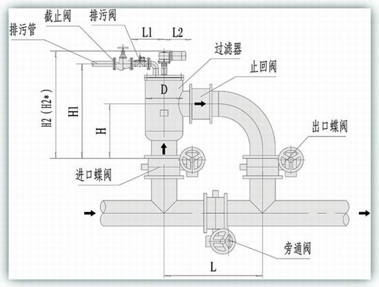 | 型號(hào) | 管徑 (mm) | 過濾 流量 (m3/h) | 過濾 面積 (cm2) | 排污 閥DN (mm) | 一次清 洗水量 (L) | 電機(jī) 功率 (KW) | 重量 (Kg) | D (mm) | H (mm) | H1 (mm) | H2 (mm) | H2 (mm) | L1 (mm) | L2 (mm) | L (mm) |