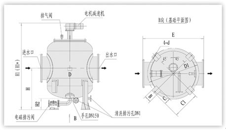| 型號(hào) | 管徑 mm | 過濾 流量 m3/h | 過濾面積 cm2 | 電磁排污閥DN1 mm | 一次清洗水量L | 清洗排污閥DN1 mm | 電機(jī)功率 KW | 重量 Kg | D mm | H mm | H1 mm | H1 mm | H2 mm | E mm | D1 mm | B mm | C mm | C1 mm | D mm |